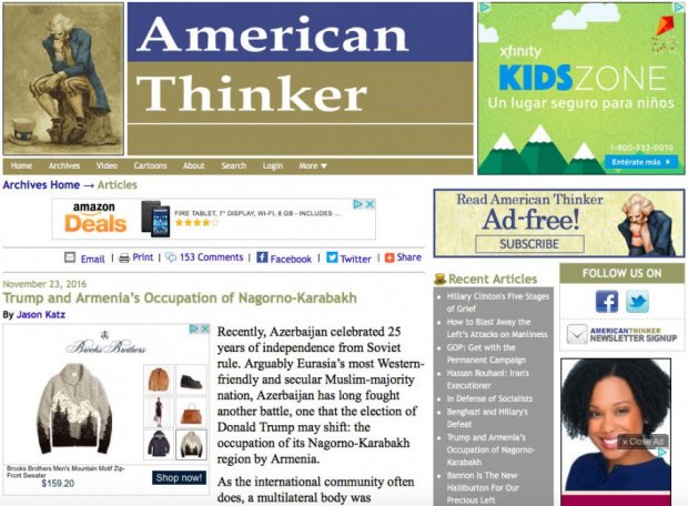 Amerikada çıxan "The American Thinker” qəzetində Los-Ancelesdəki Amerika Yəhudi Komitəsinin ictimaiyyətlə əlaqələr şöbəsinin sabiq direktoru, siyasi icmalçı Ceyson Katsın "Tramp və Dağlıq Qarabağın Ermənistan tərəfindən işğal edilməsi” sərlövhəli məqaləsi dərc olunub.